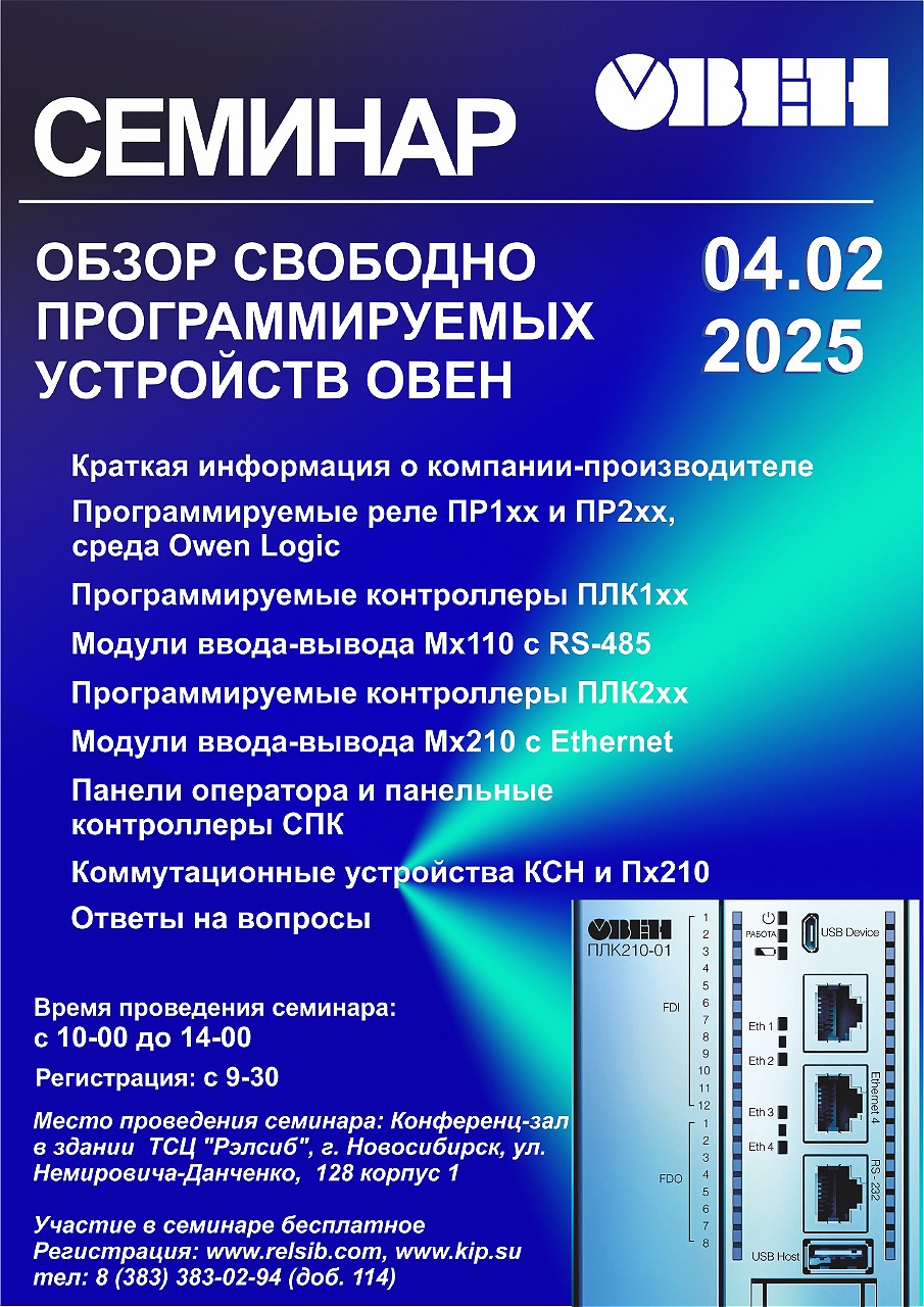 В конференц-зале НПК "Рэлсиб" будет проведен семинар "Обзор свободно программируемых устройств ОВЕН".