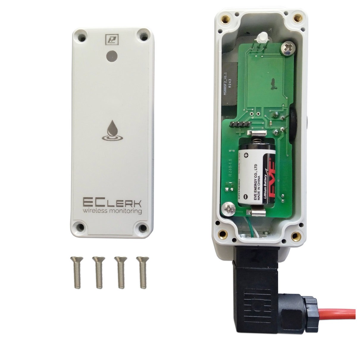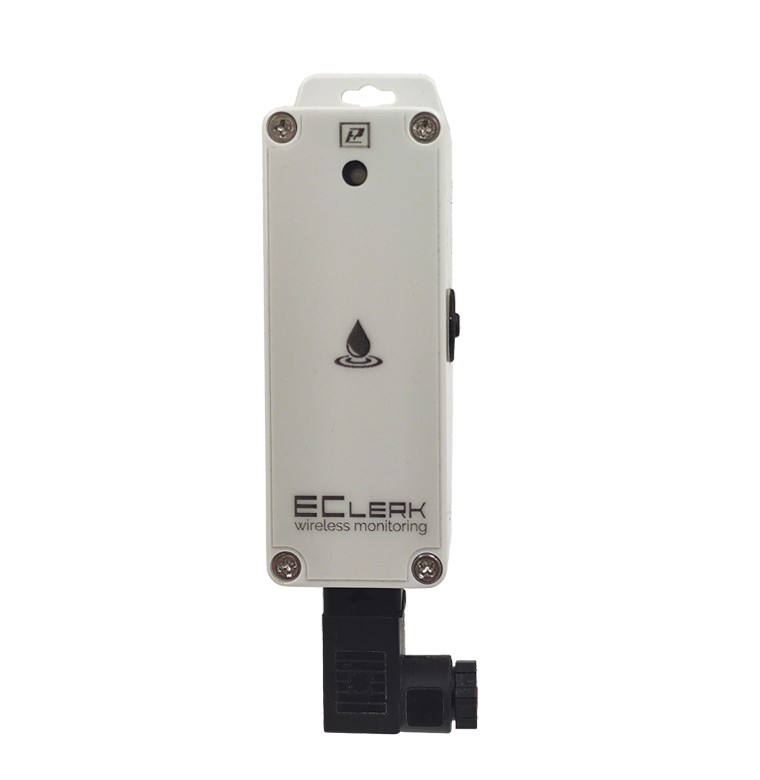 Датчики EClerk-WS-L-I предназначен для непрерывного контроля протечки, с заданной периодичностью и передачи измеренных значений по радиоканалу. Датчик имеет различные исполнения по мощности выходного сигнала, по типу работы (в широковещательном режиме или с соединением с приёмником). Длина кондуктометрического кабеля - 1 м.