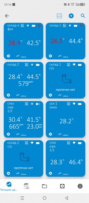 Приложение позволяет одновременно контролировать параметры с большого количества приборов (неограниченное количество отслеживаемых объектов, отображение до 12 объектов на главном экране). Архив данных ведётся по созданным пользователем объектам контроля. К объектам контроля «привязываются» датчики. Таким образом при смене датчика, архив данных не меняется. Например: температура в холодильнике, температура и влажность в лаборатории и т.д. Приложение предусматривает возможность разбиения единой базы данных на отдельные файлы с заданным временным периодом от 1 ч. до 1 месяца.