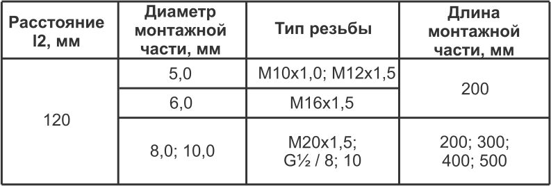 D - диаметр монтажной части, мм; l - длина монтажной части, мм; l2 - расстояние от опорной шайбы до клеммной головки М - тип резьбы